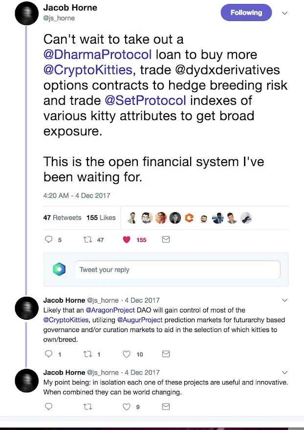The emergence of CFPs is an early sign of maturing knowledge and infrastructure of the crypto industry. The continued advancements and definitions of these primitives makes it increasingly easy for people to design consumer applications that are uniquely enabled by blockchain. On a broader scale, the crypto-financial primitives will eventually contribute to the rewiring of how society functions at large. Distributed ledger brings about new levels of user / customer sovereignty to control their own value, identity and other personal assets — both tangible and intangible.